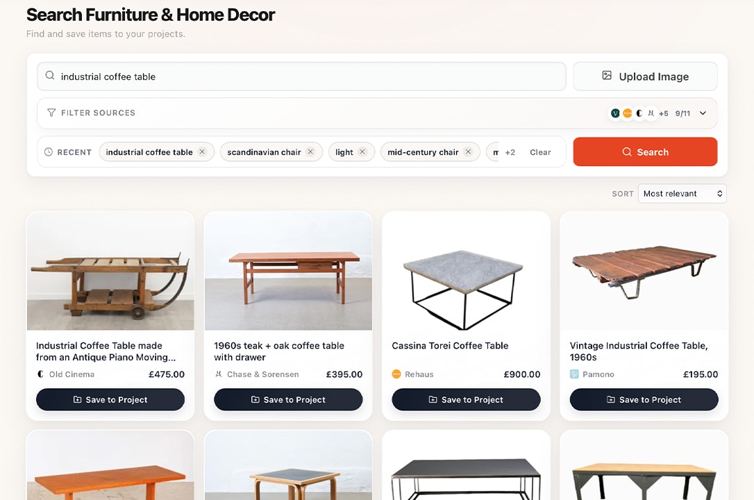 Search furniture using natural language or reference images. Redeco scans the open web and trusted sellers to surface relevant, usable pieces, FAST!