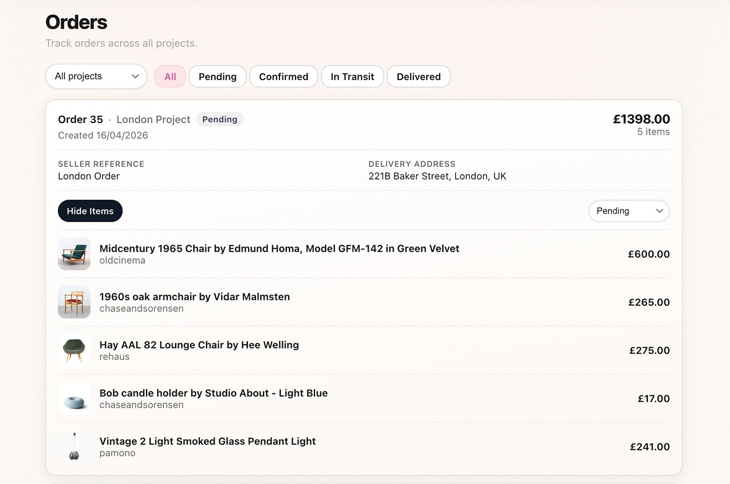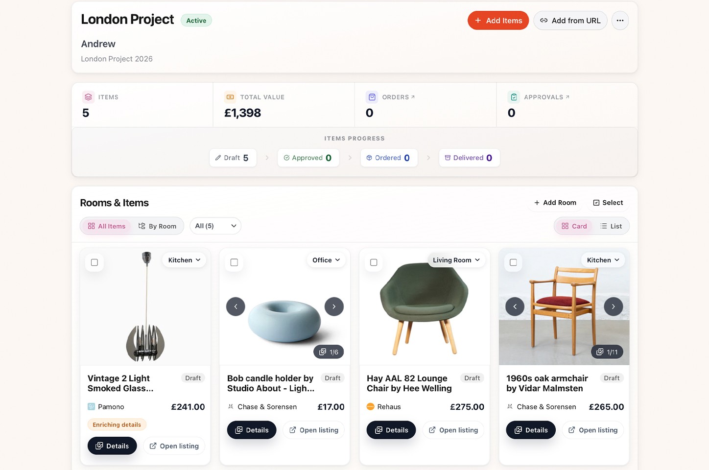 Organise items by project and room. Share selections with clients, keep decisions visible, and reduce back-and-forth.
